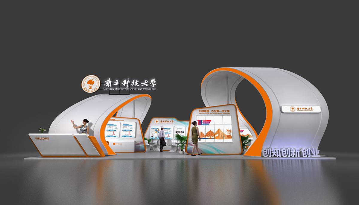 三、南方科技大学教育展展台设计创作过程与展览展台搭建现场的场景还原 1. 异型展台结构在教育展展台设计搭建中并不常见,有着特别的效果,同时,施工难度大幅度增加,这让很多参展商望而却步,南方科技大学这次在高交会中,突破了以往的设计风格,这种流线感的高识别度的异型结构是怎么设计出来的呢?熙彩展览的展览事业部的资深设计师孟庆茜进行了展台空间主案的设计工作。2. 今天,我们的资深设计师孟庆茜,对此次南方科技大学教育展展台设计搭建过程经进行分享: (1)南方科技大学这次的展台的整体结构设计采用半敞开式,充满了未来感与科幻感。 (2)展台整体采用全异型造型,圆润而流畅通的边角处理,这种风格在众多展台中脱颖而出。 (3)在色彩运用上,结合南方科技大学logo的配色,统一的运用到教育展展台搭建的设计中,让前卫的展台造型更具有整体感和造型识别度。 (4)南方科技大学展台的材料选用,因为考虑到异型结构的造价,并没有使用过多高价格材料,只是使用木制的结构为基础,整体白色乳胶漆进行表面涂刷处理,侧面封边使用了橙色灯带,合理的色彩比,结合特别的展台造型难以让人不驻足。 (5)这次南方科技大学展台搭建的灯光设计,设计师采用了多个灯箱作为补光,结构封边流线灯带,这样的灯光设计,使现场展示内容更醒目,整体的亮度也恰到好处。